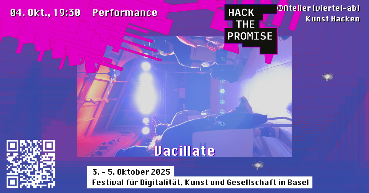The performance explores thresholds of perception, where the body becomes an instrument, attuned to the inaudible and the unseen. By collapsing the senses into one another, Vacillate opens a liminal space—where sound is felt, light is imagined, and touch becomes a complex, multidimensional language—leaving the audience in a state of altered sensory consciousness.Der in der Rubrik wird in englisch gehalten, findet um Saturday 04.10. 19:30 für 60 Minuten im Atelier (viertel-ab) statt und endet um 20:30Uhr.